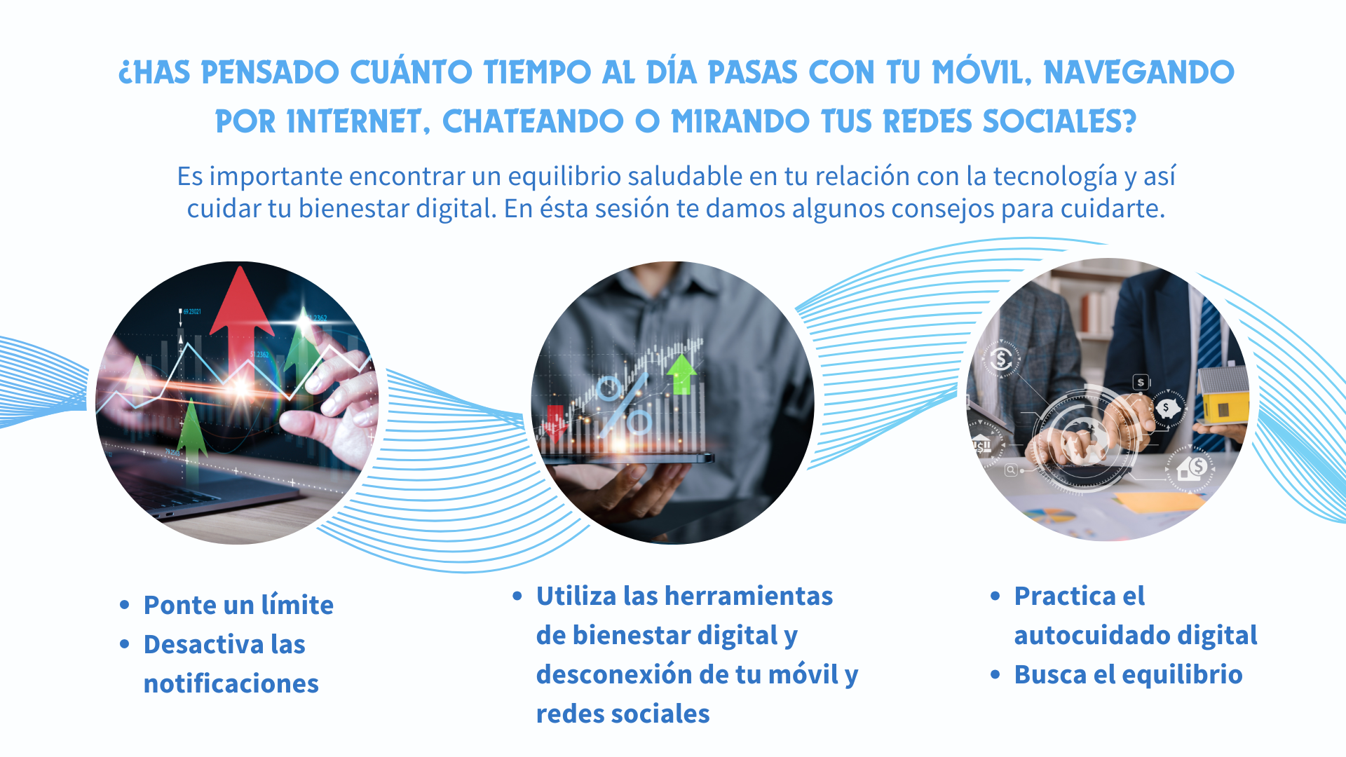 En un mundo donde las pantallas son parte esencial de nuestra vida diaria, aprender a cuidar nuestra salud mental y física en el entorno digital es más necesario que nunca. Este ciclo de tres sesiones educativas te invita a reconectarte contigo mismo, mejorar tu calidad de vida y establecer un equilibrio saludable entre la tecnología y tu bienestar.